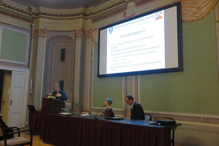 Nach einem spannenden Vortrag von Karlheinz Brandenburg (Erfinder von MP3) gab es einen Festakt, wo ehrwürdige Mitglieder der AES Austria, vor allem aus der Gründungszeit des österreichischen Vereins, geehrt wurden.